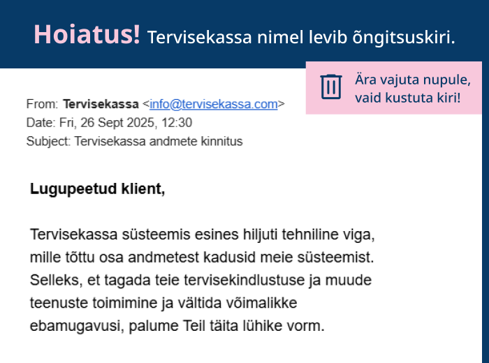 Viimaste päevade jooksul levib Tervisekassa nimel õngitsuskiri, kus väidetavalt on Tervisekassa süsteemis esinenud tehniline viga koos andmete kadumisega. See ei vasta tõele!