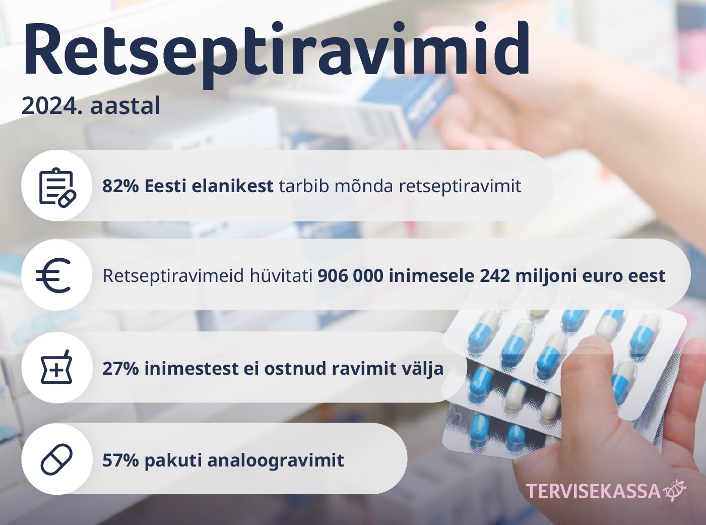Möödunud aastal hüvitas Tervisekassa retseptiravimeid 242 miljoni euro eest kokku 906 tuhandele inimesele. Kantar EMORi rahulolu-uuringu kohaselt on viimase 12 kuu jooksul retseptiravimeid ostnud 82% Eesti elanikest. Keskmisest sagedamini on ravimeid ostnud naised, 65-aastased ja vanemad elanikud ning need, kelle leibkonnas on pidevat hooldust vajavaid inimesi.